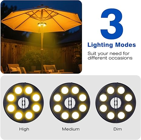 Easy to attach to any umbrella. I would have liked to be able to leave it on, however, you can’t close the umbrella when it is on. No problem though, it’s so easy to put on and take off. The three light intensities is nice as well since we tend to eat dinner late in the summer time.
