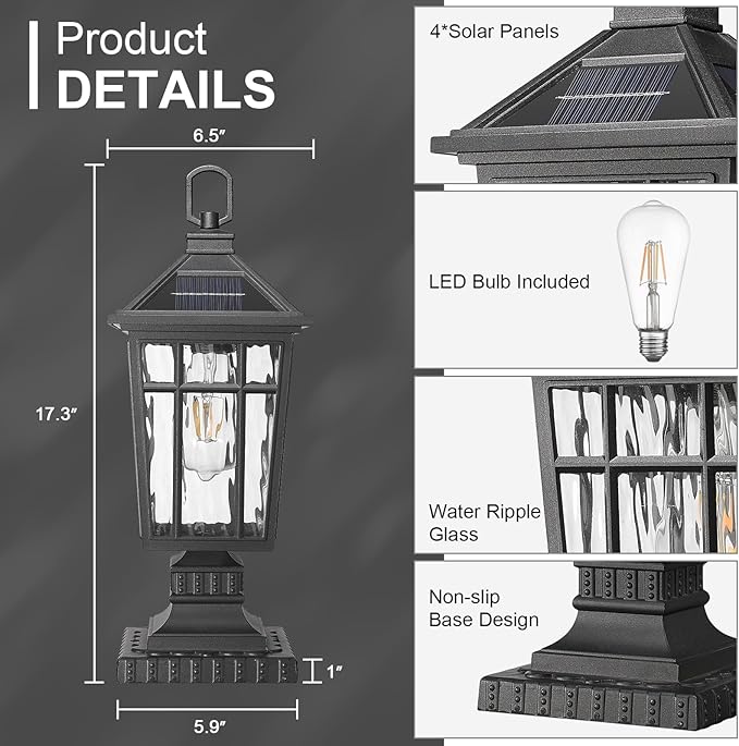 - Dusk to Dawn Solar Light- Solar outdoor table lights,It saves electricity and is more convenient.Automatically turns on at dusk and turns off at dawn, crafted of enduraing aluminum metal and water ripple glass, require little to no maintenance. Rust-proof, waterproof, shock-resistant and thermally stable, don’t worry about any bad weather.