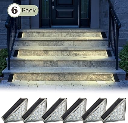 - OUTDOOR STEP LIGHTS 6-PACK – Improve the look and safety of outdoor walkways with our solar lights for steps, ideal for using for deck, patio, or porch stairs or as sidewalk lights. Each step light has 13 LEDs that provide 80 Lumens of warm white light.