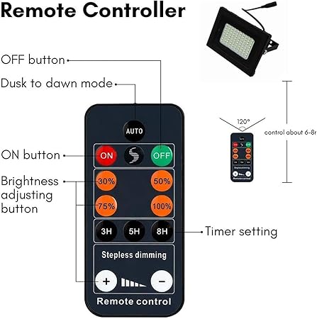 - *Solar floodlight with remote control: 80LED multi-function solar light, two-color remote control, white light + warm light, outdoor solar floodlight will turn on at dusk and automatically turn off at dawn, when you turn on the 80LED light . Die-cast aluminum and high-brightness LEDs output 60 degrees, covering a wider angle of approximately 430 square feet