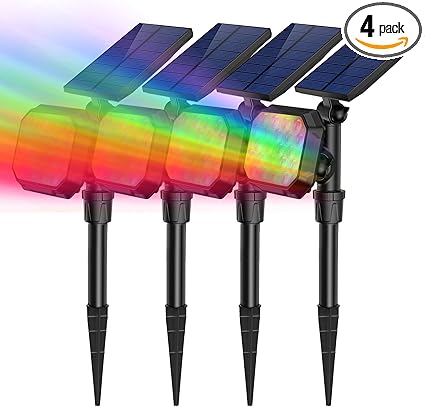 - 【High Efficient Solar Panel】-This solar spotlights adopted monocrystalline silicon solar panel with a solar conversion rate of up to 21%. This solar garden light is also used as a holiday light. The bright colors will illuminate your flags, trees, ponds, statues