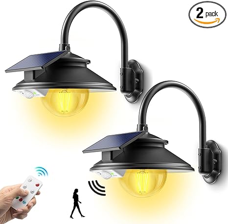 - [Solar Powered] Our solar barn lights are crafted from durable metal, pc materials. Equipped with high-capacity solar panels and a 2000mAh battery, they ensure extended runtime. The included edison-style bulb under a clear cover enhances both style and durability, and comes with a remote control for easy operation.