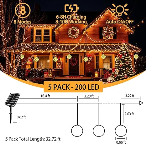 - 【Memory & Timing Function】Auto 6 hours ON 18 hours OFF timer function. The outdoor solar globe string lights can be restored from the previous setting mode while restarting.