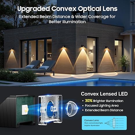 - 【Ultra-Bright Convex Optical Lens & 2 Lighting Modes】Engineered with precision-focused lenses, these solar fence lights deliver more intense and concentrated brightness, which illuminates extended beam distance than normal LEDs. Our fence lights solar powered offer 2 lighting modes(Cold White/Warm Light), you can choose the most suitable lighting mode according to your need. Despite its small size, the fence solar lights outdoor are suitable for enhancing security around doorways and garages.