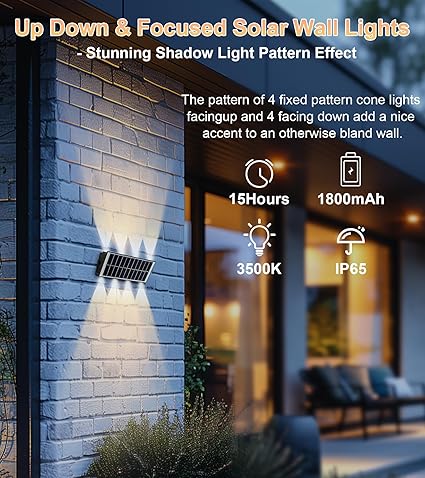 - 🌞【Up Down & Focused Fence Solar Lights】The solar fence lights outdoor waterproof has 4 led beams above and below, provides both upwards and downwards warm lighting, lighting up the yard while enhancing the sense of holiday atmosphere. The size of the solar fence lights is 7.48*2.56*3.57inch, which is a moderate size. Suitable for backyards, patios, walls, fences, terraces, sidewalks, front yards, gardens, decks, balconies, porches, trails, house, corridor, Poolside, Dining room, Cafeteria etc.