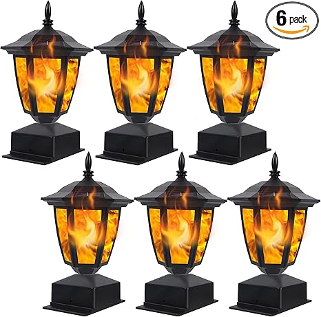- PLASTIC DANCING FLAME SOLAR POST LIGHTS: 6 pack modern post cap lights powered by solar, each with 12 pcs warm white SMD LED, they are the perfect decorative outdoor lighting and no electricity required. Solar LED flickering flameless candles lights, add a 360 degree viewing angle illuminate charming to your garden, decorate your fence, deck, porch or yard. Measurement: 5.5 x 5.5 x 10.5 inches