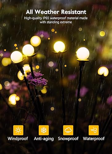 - Auto On/Off: The outdoor garden lights will be auto on at dusk and auto off at dawn.No wire connection and household electricity required, just place the solar firefly landscape lights in sunlight, and no need manual adjustment, it will charge at day and light up at night automatically