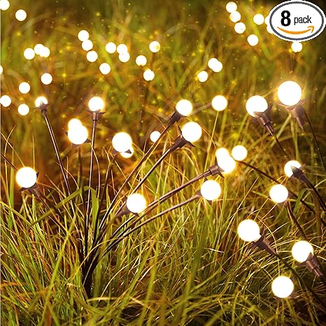 - 2 Lighting Modes – 8 pack solar stake lights with 12 white globes, warm white flashing and steady on lighting optional. Turn the switch to “ON” for “Steady on” mode, slide to “FLASH” for “Flash” mode, fantastic for creating a beautiful picture of group of fireflies flying and dancing in joy at your garden, patio or lawn