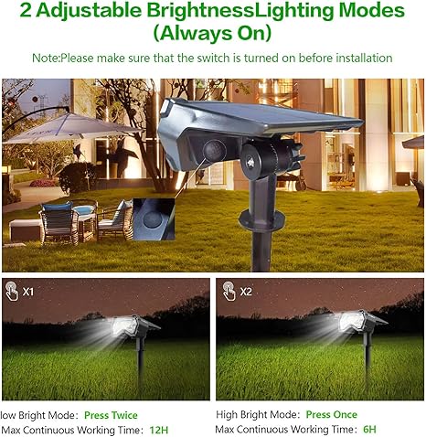 - 2 Lighting Modes: Our solar outdoor lights have dim mode, bright mode and high mode to meet your different needs. After fully charged, it can be used for 12 hours and 6 hours respectively