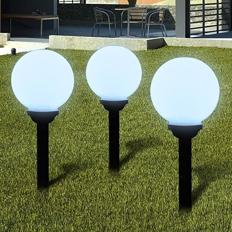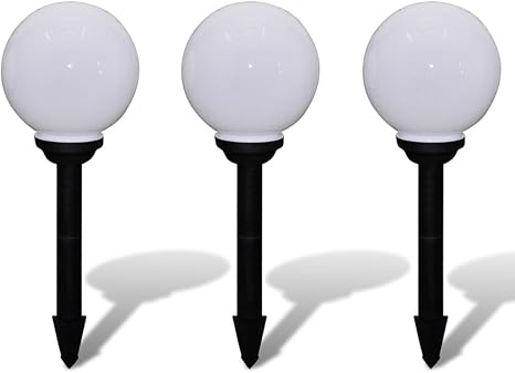 - This 3-piece LED solar light set comes complete with tubes, ground spikes and rechargeable batteries. It is a perfect decorative lighting for gardens, patios, paths, yards and balcony. Each solar ball light is made of durable plastic for years of use. With four 0.1 W LED lights inside, each piece of solar ball lamp is able to provide 0.4 W lighting.