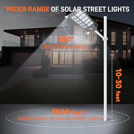 - Super Bright & Wide Lighting Range—PFCTART solar street light adopts 260 degrees wide angle lighting design and multi-array lamp beads arrangement, which can effectively illuminate large outdoor areas covering up to 2200 square feet. Long life and low light decay ensure consistent brightness throughout the area.