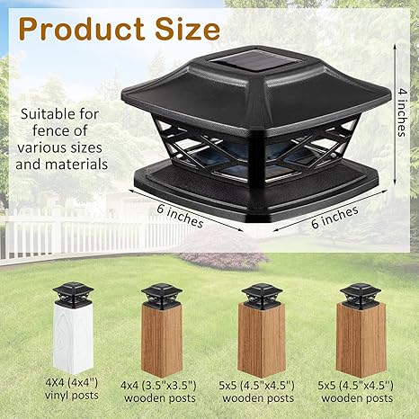 - Standard Size and Solar Powered: our solar LED fence post lights are 6 x 6 x 4 inches and fit square 4 x 4 inch vinyl posts and 3.5 x3.5 inch, 4.5 x 4.5 inch, 5.5 x 5. 5 inch wooden posts; These waterproof solar cap lights are powered by solar energy, so you don’t have to worry about consuming batteries, and they can stay bright for a long time