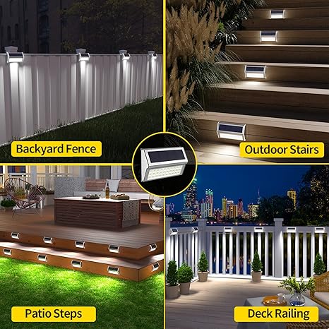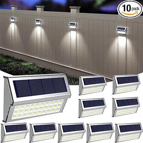 - Modern Solar fence Lights: Solar powered outdoor lights built-in 30 long-life LED beads can be easily illuminating the pathway, deck, patio, stairs and fence to improve the safety of you and your family and property at night. Not a super bright solar light, but 30 lumens brighter than other 3LED stainless steel solar lights