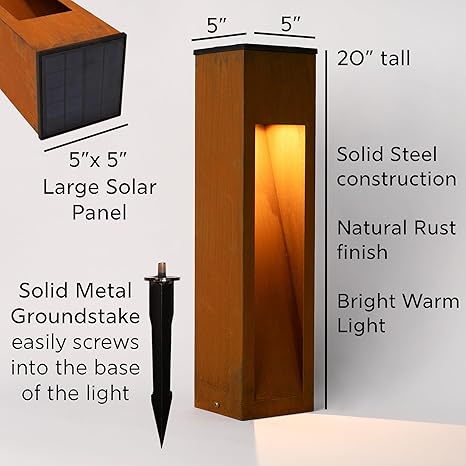 Solar Metal Rectangular Slot Light with Rust Finish, 5x5x20 Inch