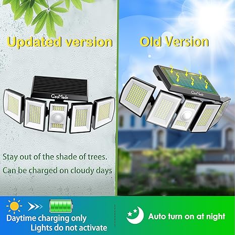 - 【Long Working Time & Super Bright 300 Leds 】 This GeoMade solar lights outdoor waterproof has a built-in 300 super bright SMD 2835 LED, which produces high brightness up to 6500k and 1100lm at a range of 270° degress. This solar powered outdoor lights has a built-in 2200mA rechargeable battery with a high-efficiency solar panel.