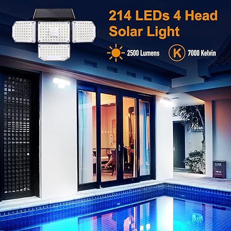 - 【Ultra Bright 4 Head Solar Light】SUDAXONG Solar lights outdoor features an innovative 4 head design with 214 LED and a high brightness output of 2500LM 7000K, plus a honeycomb diamond shaped polygon lens. solar flood lights outdoor with multi-joint rotatable shaft and individually adjustable solar panels and spotlights can adjust the angle to your needs, providing a wider, brighter and more flexible lighting range.
