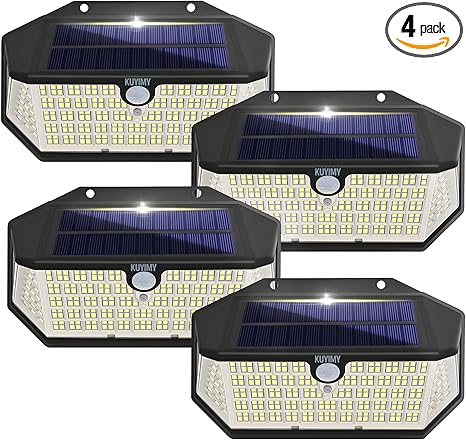 - KUYIMY solar outdoor lights use 266 high-quality “2835” smd LED lamp beads, produce up to 300 lumen daylight, unique 5 sides 220° wide angle illumination, Bring large areas of bright lighting. Suitable for outdoor lighting, such as yard, garage, porch, fence, patio, driveway, deck, front door, garden, pathway, backyard or other dark areas around your house.