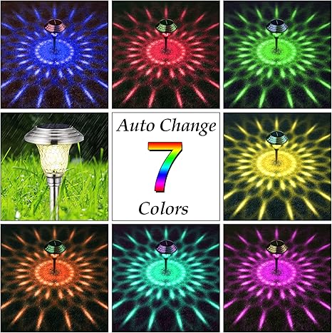 - 【2 Lighting Mode Color Changing & Fixed Color】BEAU JARDIN Solar outdoor walkway lights solar are designed with 2 light modes(Color Changing & Fixed Color). When the button In Middle mode,the light will automatically changing 7 variaous colors, turn the button to the right, will lock the current color, you can set any of the 7 color you like. The glass housing makes our lights more brighter than ordinary solar path lights,which can be more perfect to project colorful sunflower pattern,you can decorate and illuminate your garden,lawn,walkway,yard,making them more beautiful and colorful.