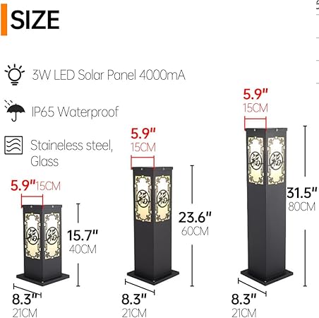 - Wide Application — The solar bollard light uses 3000K warm lighting. You can use the vintage garden landscape lights anywhere, such as decorating the garden, backyard, lawn, party, balcony and so on.