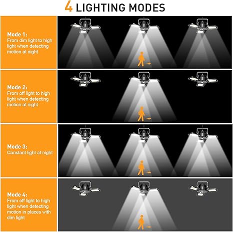 - 4 Lighting Modes with Motion Sensing: Built-in high sensitive motion sensor detector, this solar pendant light has 4 Modes–Mode 1: Dim-to-Bright with Motion at night(dim light without sensing moving and high light 15s when motion detected), Mode 2: Off-to-Bright with Motion at night(High light 15s when motion detected then turn to off), Mode 3: Constant Light at night, Mode 4: All day induction lighting (High light when motion detected and turn off when person leaves the detected area.)