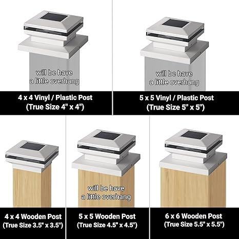 - EASY TO ASSEMBLE: Complete with detailed instructions. Our fence post solar lights come with different sizes of bases, which are compatible with any standard true size 3.5″x3.5″, 4″x4″, 4.5″x4.5″, 5″x5″, 5.5″x5.5″ wood / vinyl / plastic post cap. These solar garden lights can be done in a few minutes, comes with mounting kit, simply screw the solar cap lights into highest point on the railing