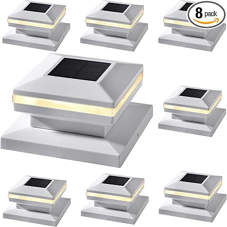 - WHITE PLASTIC SHELL SOLAR POST LIGHTS: 8 pack post cap lights powered by solar, each with 8 warm white SMD LED, they are the perfect decorative outdoor lighting and no electricity required. The solar panel supports long-term operations. Add a 360 degree viewing angle illuminate charming to your garden, decorate your fence, deck, porch or yard. Measurement: 5.8 x 5.8 x 3.2 inches