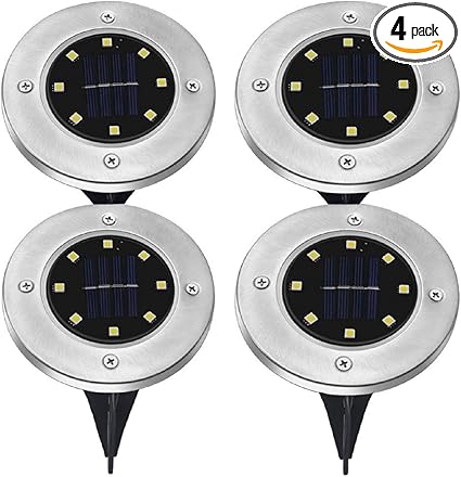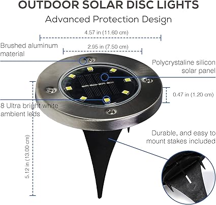 - BRIGHT LED DISC LIGHT: The product uses 8 LED Bulbs, the illumination range and effect is bigger and brighter. It can be mounted on your driveway, pathway, sidewalk and other areas of your lawn, yard to help to illuminate your path, making it safer, but also adds a beautiful scene to the night view after dark.