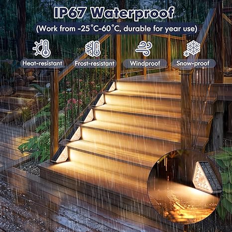 - 【IP67 Weather Resistant】Constructed with an IP67 waterproof rating and made of sturdy ABS materials, our LED deck lights for outside endure various weather conditions, including storms, heavy snow and intense heat (Working temperature: -25°C-60°C). Compared with other IP44 solar powered fence lights that easy failed, our 16-pack motion step lights are more durable and long-lasting. Kondras practical outdoor lighting elevates the safety of your fences, backyards, patios, porches, and pools