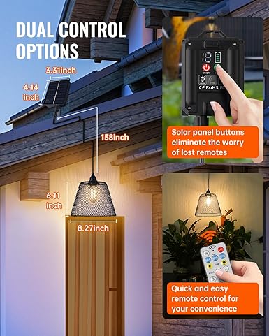Lighting up backyard pergolas or gazebos this overhead light is an easy to wire up fixture. It runs entirely off a solar panel using lengthy waterproof cord that lets me position it towards sunlight at a distance from where I mounted this light. It did lack hooks or mechanism above the metal lampshade and simply meant using bit of DIY to attach overhead. At 5V its Edison style bulb did feel bright enough to illuminate a small area underneath but range is only about 4 to 6ft of lighting. On backside the solar panel has an integrated battery and controls toggle effects that makes the light feel sparkly setting mood for relaxing outdoors. Small but simple to run using solar power adding bit of night to outdoor pergola.