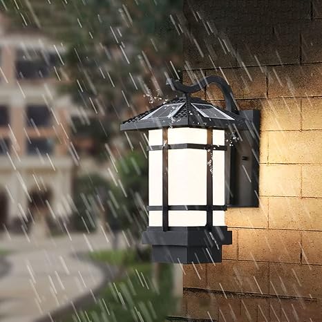 - Retro External wall lighting fitting: Retro geometry die cast aluminum solar wall wash light. Geometric die-cast aluminum exterior Wall Sconce Fixture, acrylic lampshade. A rustic black metal finish surrounds the body, not only decorating your outdoor garden, but also illuminating your way at night.