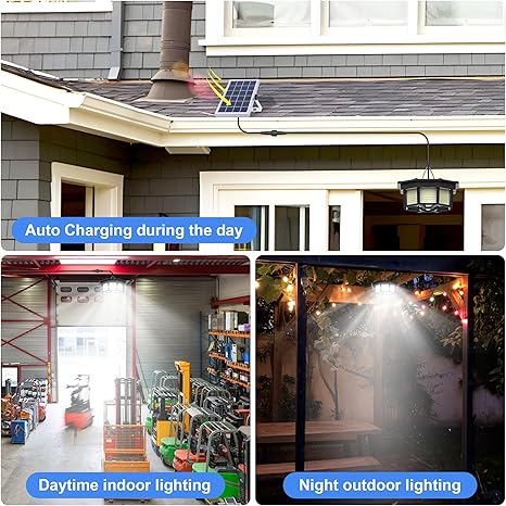 - Two Daytime Work Modes & Remote Control: Unlike traditional solar outdoor lights, our solar pendant light has the unique feature of providing continuous lighting during the day (modes4-5). In Mode 4, the movement triggers 15s of lighting; Mode 5 provides continuous lighting throughout the day and switches to Mode 4 when the battery reaches 50%. By adjusting the modes with the remote control, you are able to easily use our solar powered shed lamps in dimly lit indoor areas without having to pay for electricity, due to solar energy is free