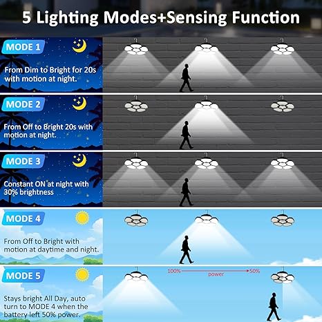 - Remote Control: You can turn on/off the solar light and select different modes by remote control. With four levels of brightness adjustment, including 25%, 50%, 75% and 100%. Timing function, to set the timer lighting: to 2 hours, 4 hours, and 6 hours