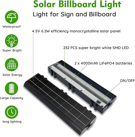 - 【High Quality PC Material】- Solar billboard light is the best choice for commercial advertising signs. while the solar panel frame is made of high-strength-resistant PC, which can be fixed on any billboard, sturdy and durable. PC is characteristed by high strength and wear resistance and is harder than ABS, making it the best material for outdoor billboard lighting.