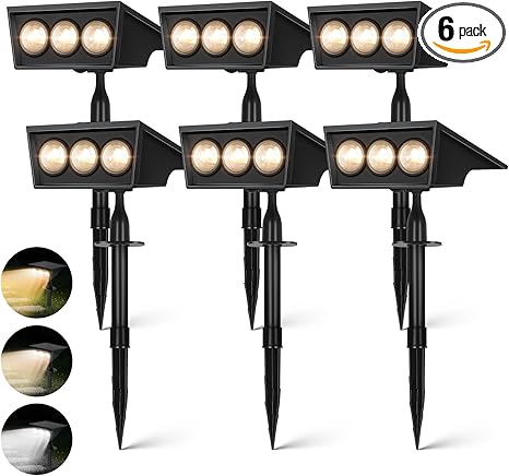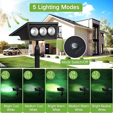 - 5 Lighting Modes & Smart Auto On/Off – Our solar spotlight outdoor waterproof offers 5 adjustable modes: bright cool white, medium cool white, bright warm white, medium warm white, and bright natural white, providing versatile lighting. With smart memory function, our outdoor solar lights remember your last brightness and mode, ensures automatic operation from dusk-to-dawn
