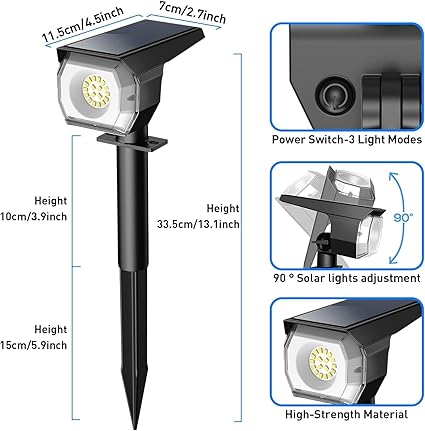 - 3 LIGHTING MODES: The outdoor solar lights feature a light sensor system that automatically turns on at nightfall and off in the morning. There is one button to switch between the three lighting modes: Low light mode lasts 18 hours, Medium light mode lasts 12 hours, and High light mode lasts 6 hours.(Note:Whether solar spot lights outdoor can produce the best lighting effect is related to factors such as sunlight intensity, weather conditions, seasons etc