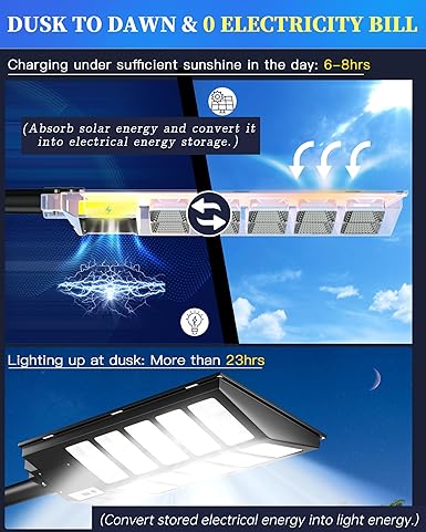 - 【No Electricity Bill 】 — Gefolly SL-5200W solar street light provides 6500K daylight white light. and it’s equipped with 320pcs 5054 type super bright LED beads and a 33000mAh battery(life up to 50,000 hours). IP67 waterproof grade makes it work well even in bad weather all year round. Solar-powered, no electricity bill produced, automatically turns on at dusk and turns off during the day, with continuous lighting for up to 36 hours (when fully charged). Note: The remote controls that come with the light are available in white and black. The white and black remote controls are shipped randomly.