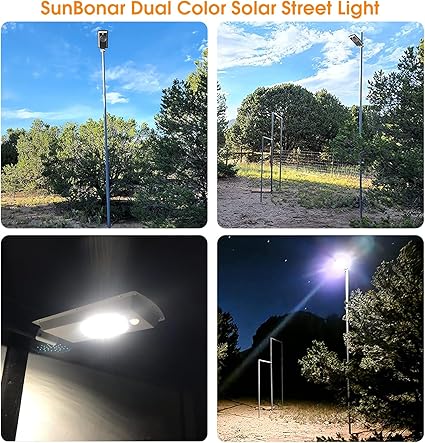 - ☀【DUAL-COLOR SWITCHABLE】The lighting color of SunBonar intelligent solar street light can be switched between cool white and warm white by pressing remote, which makes the light to meet a wide variety of usage scenarios. Cool white for area security lighting: Garden, Pathway, Garage, Driveway, Court etc, Warm white for ambience lighting: Patio, Courtyard, Party, Celebration, Festival etc.