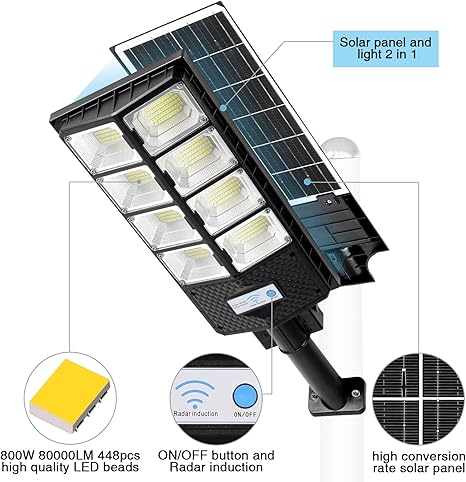 - 【Extremely Bright】10000LM Solar Street Lights outdoor waterproof provides 6500K daylight white light and it’s equipped with 448pcs super bright SMD 2835 LED beads. The lamp beads are more than twice as large as normal and 3600mAh battery(life up to 50,000 hours).