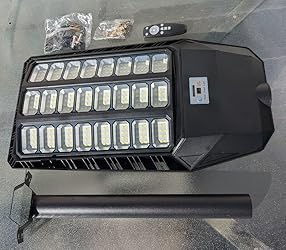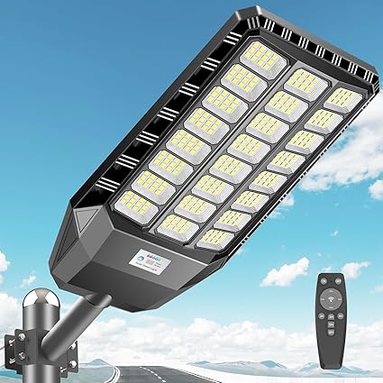 This solar street light is a durable and efficient outdoor lighting solution designed to withstand harsh weather conditions with its IP67 waterproof rating, high-quality ABS materials, die-cast aluminum frame, and nanoscale waterproof coating. It offers a cost-effective, eco-friendly alternative to traditional lighting with its dusk-to-dawn feature and a 6V-52000mAh battery that provides 12–14 hours of continuous light after a full charge and up to 36 hours in low-light mode. Equipped with 1008 high-efficiency 5054 SMD lamp beads, it delivers 450,000 lumens of brightness at a 7000K color temperature, illuminating up to 6,000 square feet. Intelligent control options include motion sensing, timed lighting, and adjustable brightness with a remote control range of 35 feet. Easy to install on walls, poles, or other outdoor structures, it is ideal for parking lots, streets, parks, and courtyards, or my garden; combining durability, energy efficiency, and versatility for reliable outdoor lighting.