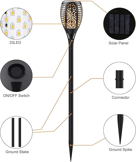 - 【Solar Torch Light with Flickering Flame】Solar flame torch flicker a gorgeous dancing flames, a safe alternative to the real “flames”, it casts a safe, soft and mood-enhancing glow. Come with extension rods, you can choose the height of 23inch or 32inch you want.