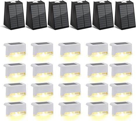 - Easy to Install: All solar lights require no additional wiring for installation; 20 pack solar deck lights has no switch, just pull out the insulator tab to use, use the strong double-sided tape or screws included in the package to mount along various edges; 6 pack solar wall lights use the spacing templates (included) to mark the locations of the mounting, you need to drill two holes and push in the expansion pillar and screws, the screws need to stand out from the wall about 0.24 inch/6mm, the