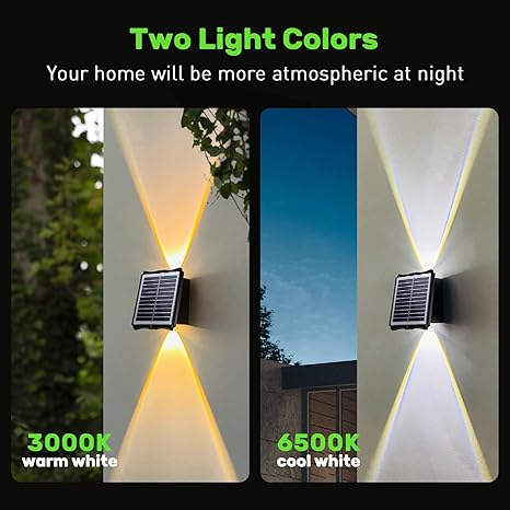 - 6500K/3000k Two Options: This solar wall light is available in two light colors, one is warm light(3000k) and the other is cool white light(6000k). You can choose your favorite light color before installing the solar outdoor wall lights, if you want better visibility, you can select cool white, if you need to create an ambiance, you can choose warm light. The solar lights outdoors will brighten up your space and enhance your landscape.