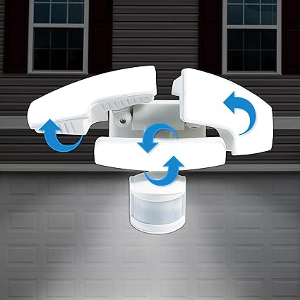 - Ideal for all locations: entryways, garages, pathways, sheds, and remote areas. It comes with adjustable side lamp heads that move horizontally and vertically while a middle lamp head moves up and down for maximum lighting coverage.