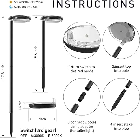 - 【Easy to Install】- Solar path lights require no wiring. Simply insert the ground spike into the ground, attach the light and pole, and slide the switch to the desired light color. You can choose different mounting height (13 inches or 26 inches).