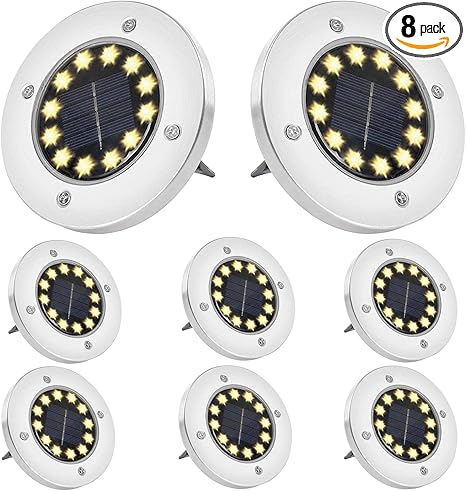- Upgraded outdoor Bright Solar Ground Lights with 12 LED : Our solar disk lights outdoor is with 12 LED lights which means the illumination range and effect is bigger and brighter. The outdoor garden solar deck lights provide a delightful glow to your driveway, pathway, sidewalk and other areas of your lawn, yard, patio, garden or flower beds