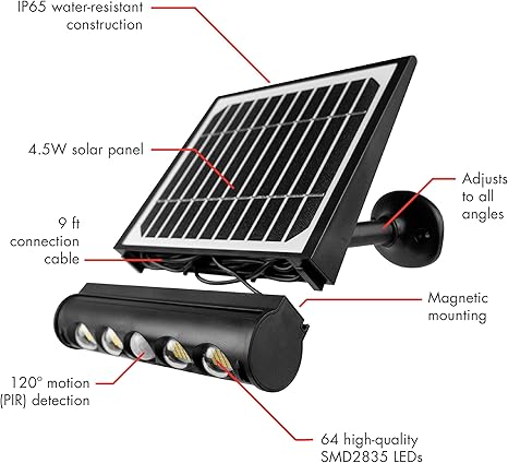 - 【PIR MOTION SENSOR】 – Equipped with our popular 120° PIR motion sensor, this light will pick up animal and people movement for hands-free illumination.