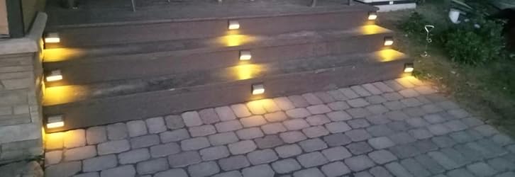 We really enjoy these stair riser, solar lights. The width of stairs is 12ft. We placed 3 across each riser. We opted for this type over others that partially mount to step and then onto riser to prevent tripping and for ease of shoveling snow off steps. Easy install. The mounting screws placed on front face of risers, not behind. Then mount light on screws. Solar lights face West and receive enough sunlight to keep these lit well overnight. No batteries required.