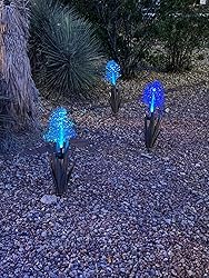 I love solar lights and have many in a solar garden in my backyard. When these lights arrived, they were bigger than I was expecting, but more beautiful. The way that the LED fibers light up and change colors is so beautiful. Not sure why they are promoted as Christmas lights though, when they don’t look anything like Christmas or Christmas colors. These lights were easy to assemble as the metal leaves needed to be separated and the LED fiber lights attached. Super easy. The difficult part was securing them in the ground. I soaked the ground, because the ground here is hard, but even when I was able to push a screwdriver easily in to the ground, the metal stakes on the solar lights kept bending. I had to pull the stake back in to place and keep trying. They bend way too easily. I’m not happy with the quality.